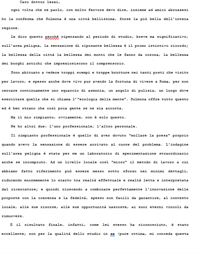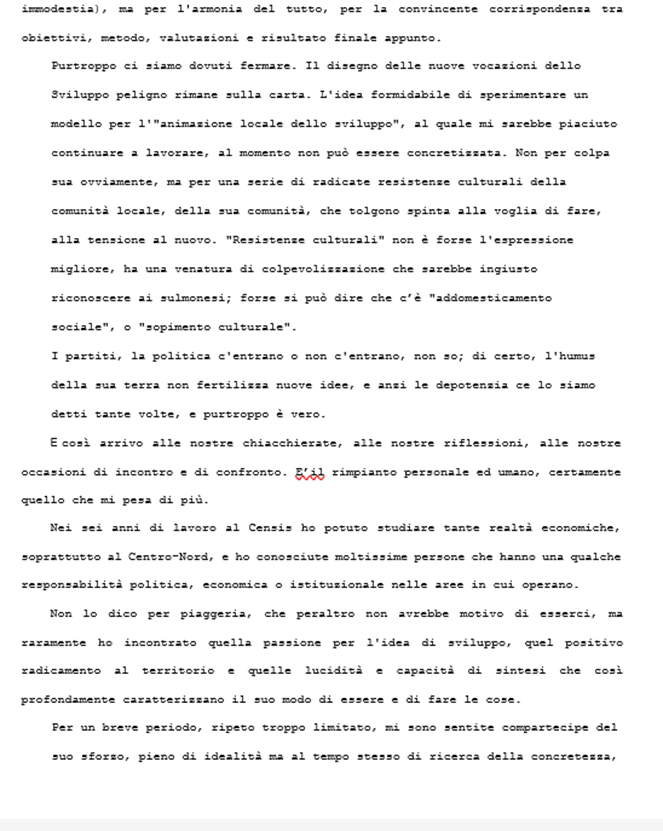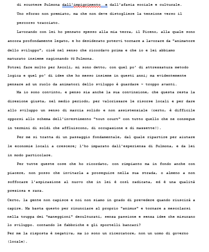 Mi disse che dovevo comprendere che bisognava sempre “conservare gli equilibri politici”: una spiegazione senza senso. Insistetti perché chiarisse, mentre lui, intanto aveva aperta la portiera della macchina per sedersi. Impedii che lo sportello si richiudesse e, fuori di me, cominciai a gridare. A questo punto si arrese, uscì dalla macchina, mi chiese di calmarmi e ci appartammo in un luogo più tranquillo. Mi confessò che un autorevole personaggio del PSI sulmonese aveva minacciato fuoco e fiamme se ci fosse stato un incontro con me, “notoriamente avversario del loro partito”. Mi fece anche il nome. Io non lo ripeterò rispettando il fatto che questa persona è deceduta.